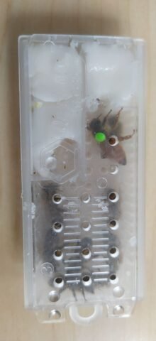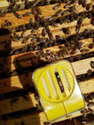 Reine introduite aussitôt l’après-midi en remplacement d’une reine à tendance agressive et fortement essaimeuse (2 essaimages en 2 ans). Pour maximiser les chances d’acceptation, j’ai tué et “badigeonné” l’ancienne reine sur la cage avant introduction.