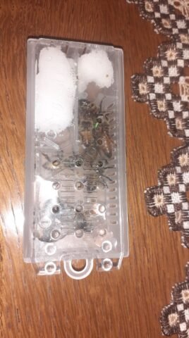 Je m’attendais à recevoir la reine plus quelques accompagnatrices mortes comme annoncé, mais tout ce petit monde se portait bien. Petits plus, la Reine était marquée et la cage à deux entrées.