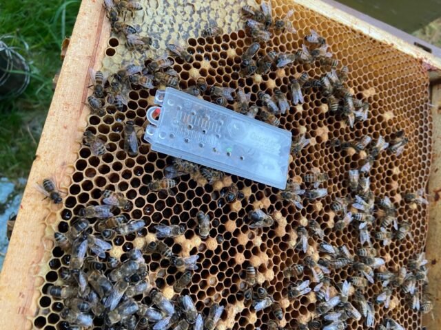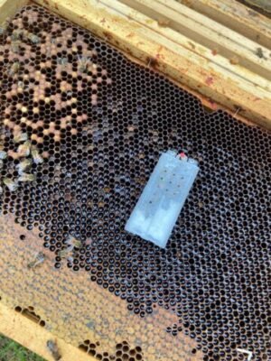 Reine expédiée le 2/7 reçue le 9/7 – 1 accompagnatrice décédée. Introduite sur couvain naissant après avoir sarclé les cellules royale et nourrissement spéculatif _ OK bien acceptée.
