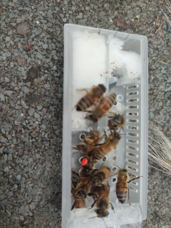 Chaque reine est marquée en blanc ⚪ (couleur officielle 2026) et envoyée dans une cage plastique rigide, accompagnée d’abeilles nourrices et de nourriture.