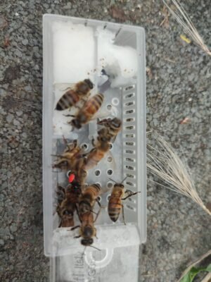 Chaque reine est marquée en blanc ⚪ (couleur officielle 2026) et envoyée dans une cage plastique rigide, accompagnée d’abeilles nourrices et de nourriture.